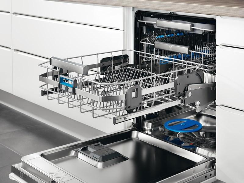Horní košík má 2 skládací držáky, 2 skládací drátěné držáky pro skleničky, 2 měkké špičky, 6 měkkých špiček pro vinné sklenky, skládací poličky na šálky, nerezové držadlo Electrolux