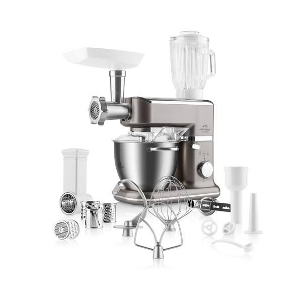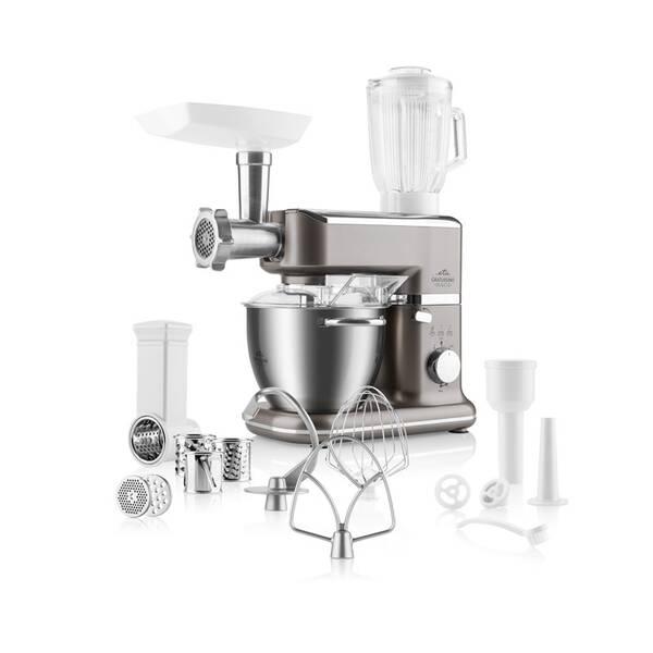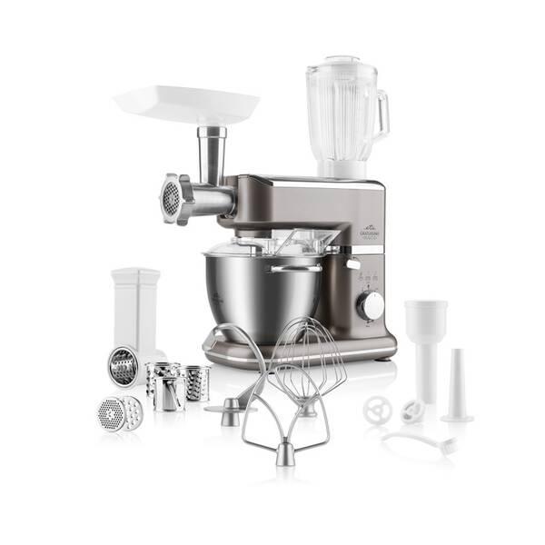 Kuchyňský robot ETA Gratussino Bravo II 0023 90070:Kuchyňský robot ETA Gratussino Bravo IIKuchyňský robot ETA Gratussino Bravo II je užitečný pomocník do vaší kuchyně. Díky planetárnímu systému míchání bude těsto dokonale vyhnětené a výsledek jednoduše ohromující. Potěší vás bohatá výbava, se kterou můžete šlehat, mísit a hníst těsto. Hravě si poradí také se strouháním zeleniny a ořechů, s mletím masa, plněním uzenin, a dokonce i s tvorbou masových trubiček Kebbe. Připravíte díky němu smoothie, polévky i zmrzlinu.Není vyplněn Alternativní text k fotografii!Kuchyňský robot ETA s bohatým příslušenstvím.Kovová převodová kola a bezpečnostní prvky pro bezpečný chod.Robot ETA Gratussino Bravo je kompatibilní s brouskem na nože, který lze dokoupit (není součástí balení).Výkonný 800 W motor se stabilizátorem.Výkonný motor se stabilizátorem Výkonný motor se stabilizátoremKuchyňský robot Gratussino Bravo disponuje 800 W motorem se stabilizátorem pro udržení nastavených otáček i při větším zatížení. Protiskluzové nožky zajišťují stabilitu.Není vyplněn...